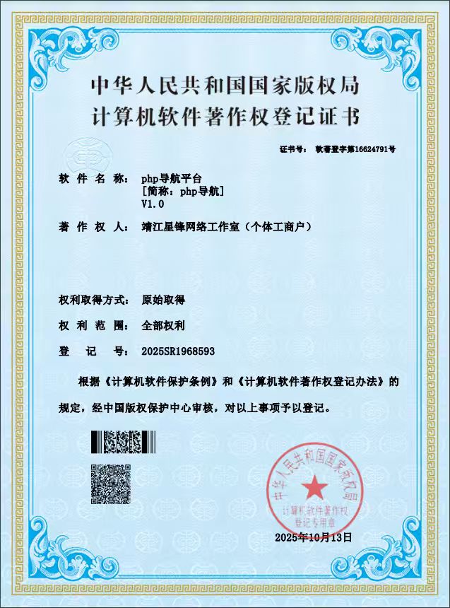 《php导航平台》受国家计算机软件著作权保护(登记号:2025SR1968593)
